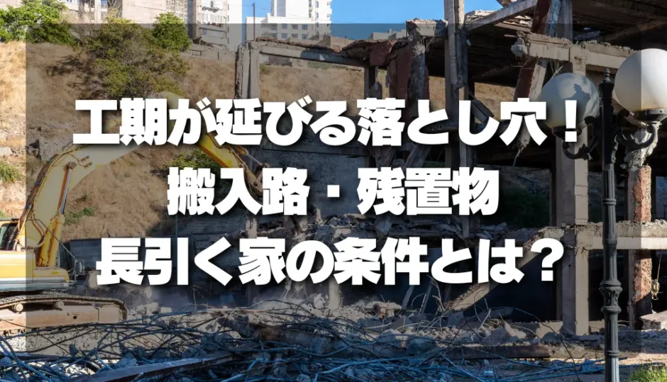 ただし、これらはあくまで「理想的な条件」での日数です。搬入路が確保され、残置物がなく、天候にも恵まれた場合の話であり、実際の現場ではさまざまな要因が重なって工期が延びるケースが大半といえます。