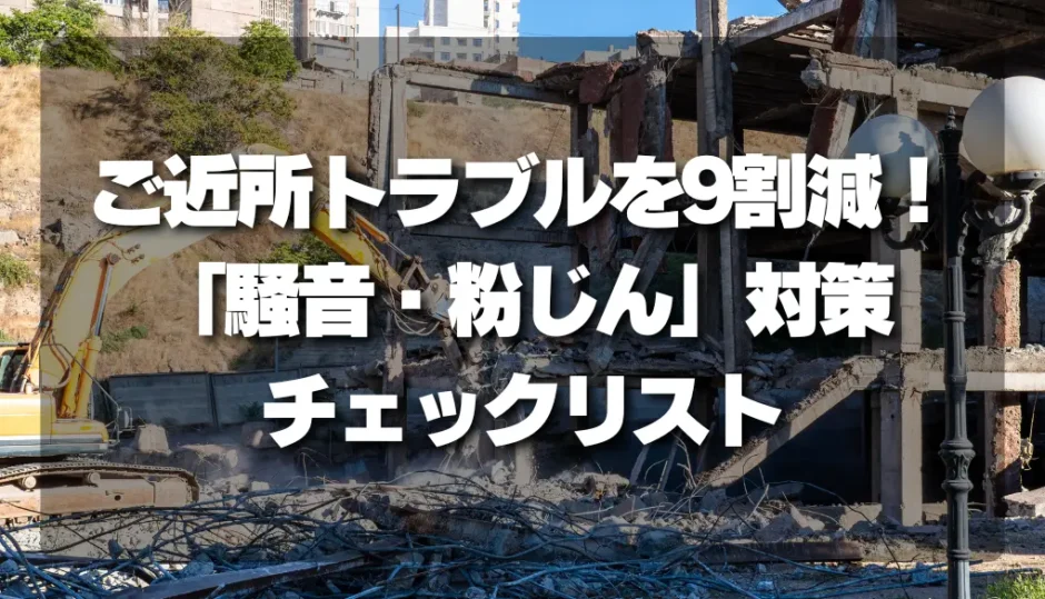 養生・散水・時間帯の3点を中心に、近隣クレームを防ぐために押さえておきたい確認ポイントをシンプルに整理しました。業者との打ち合わせや業者選びのときにぜひ役立てください。